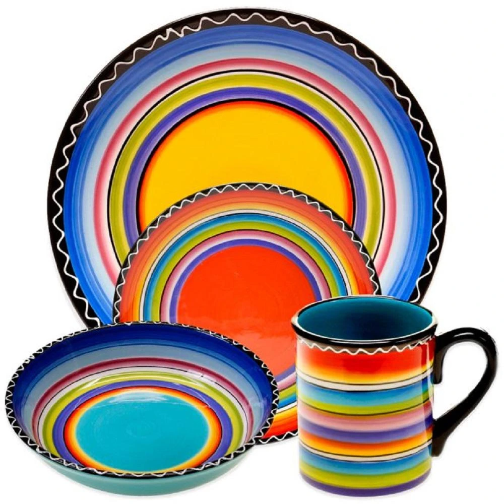 Tequila Sunrise 16 piece ceramic dinnerware set designed by Nancy Green. Each item is hand painted with lively stripes around coordinating assorted solid colors. Create a fiesta every day in your home with this exciting collection which includes 4 pieces each 11dinner plate , 9salad plate, 18 oz. mug and 5.25 X 3 all-purpose bowl. Dishwasher and microwave safe.
