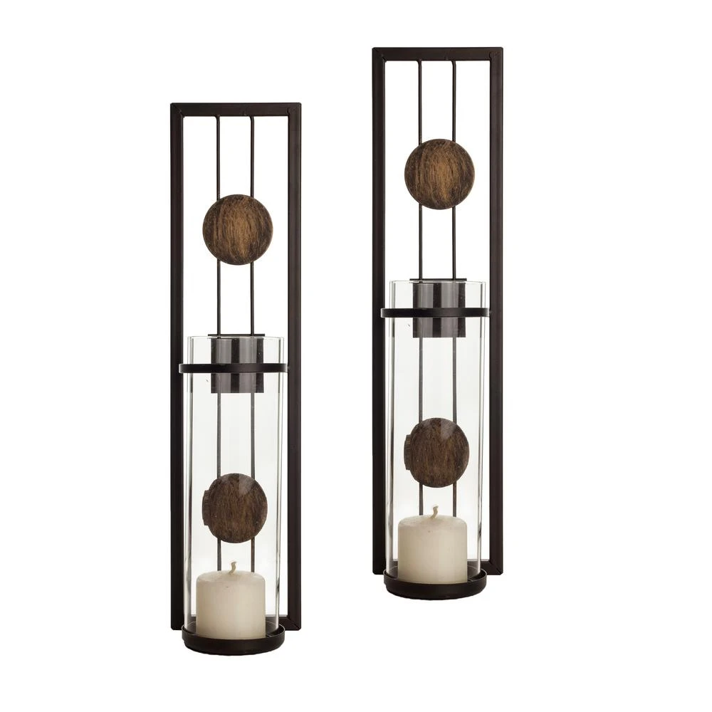 Add an elegant, romantic touch to your home decor with a Danya B set of contemporary wall sconces. These stylish, contemporary set of wall scones features an iron backing with a modern abstract design of geometric shapes. The sophisticated scones have cylindrical candle holders made of clear glass. Light your pillar candles or use flameless candles with a timer at night and watch the soft glow of the light play beautifully off of the scones.
