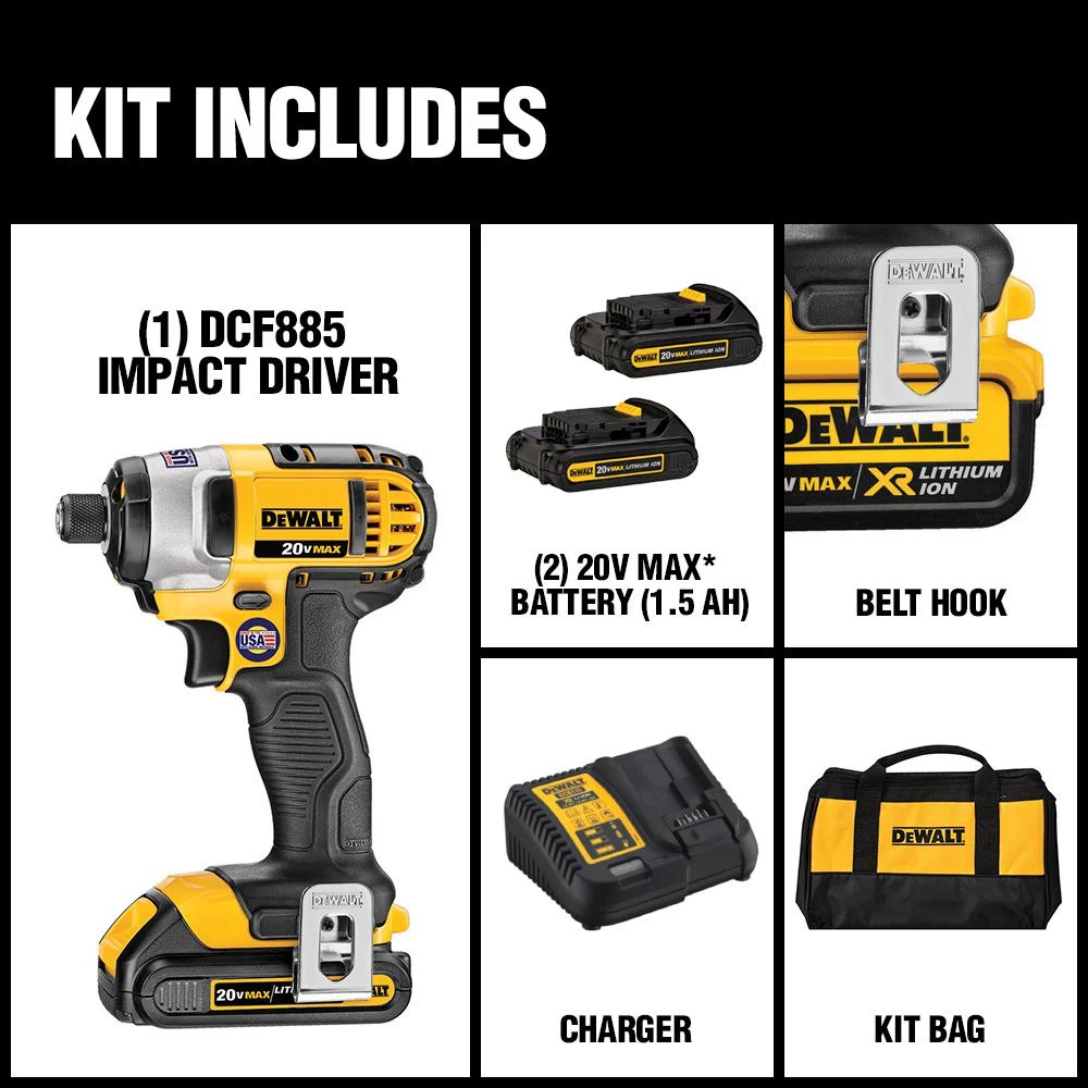 - Includes impact driver, two 20-Volt batteries, charger, belt clip and bag