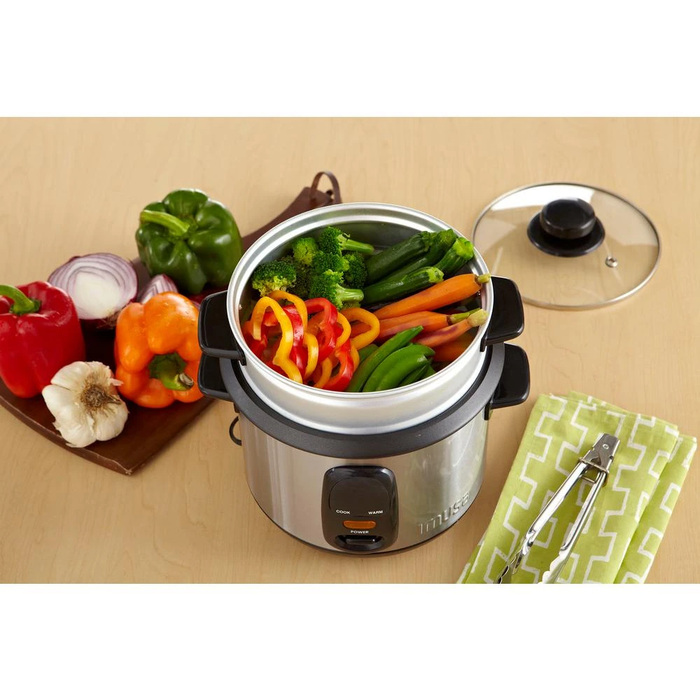 - Steamer insert on the 10-cup model for steaming foods while cooking rice