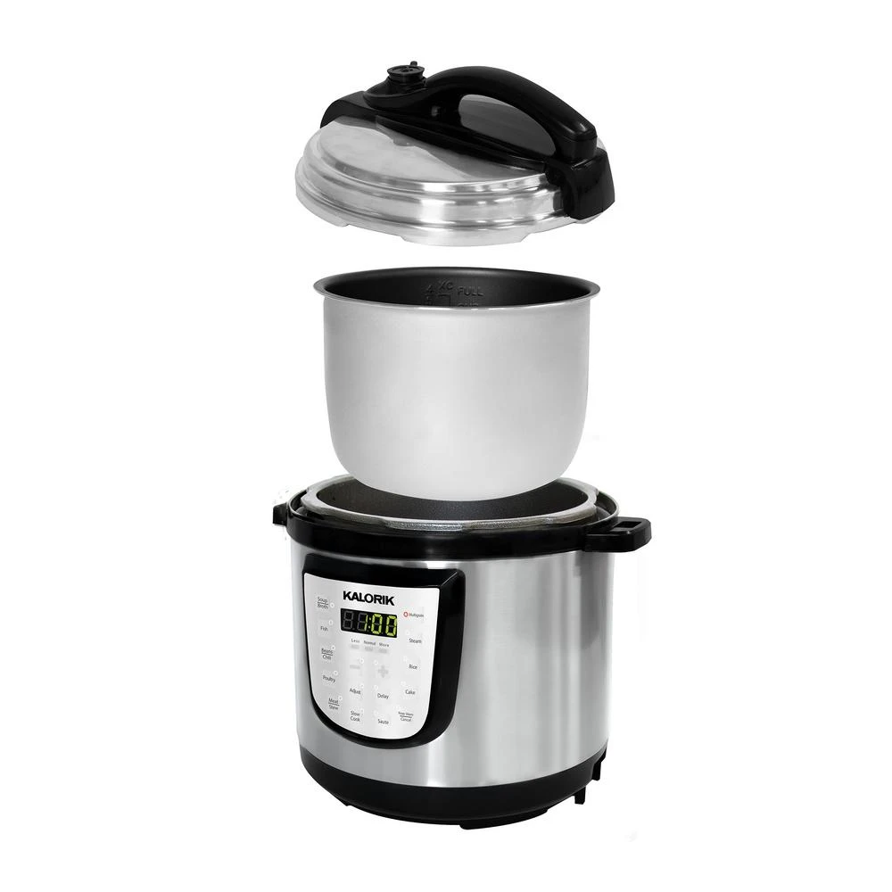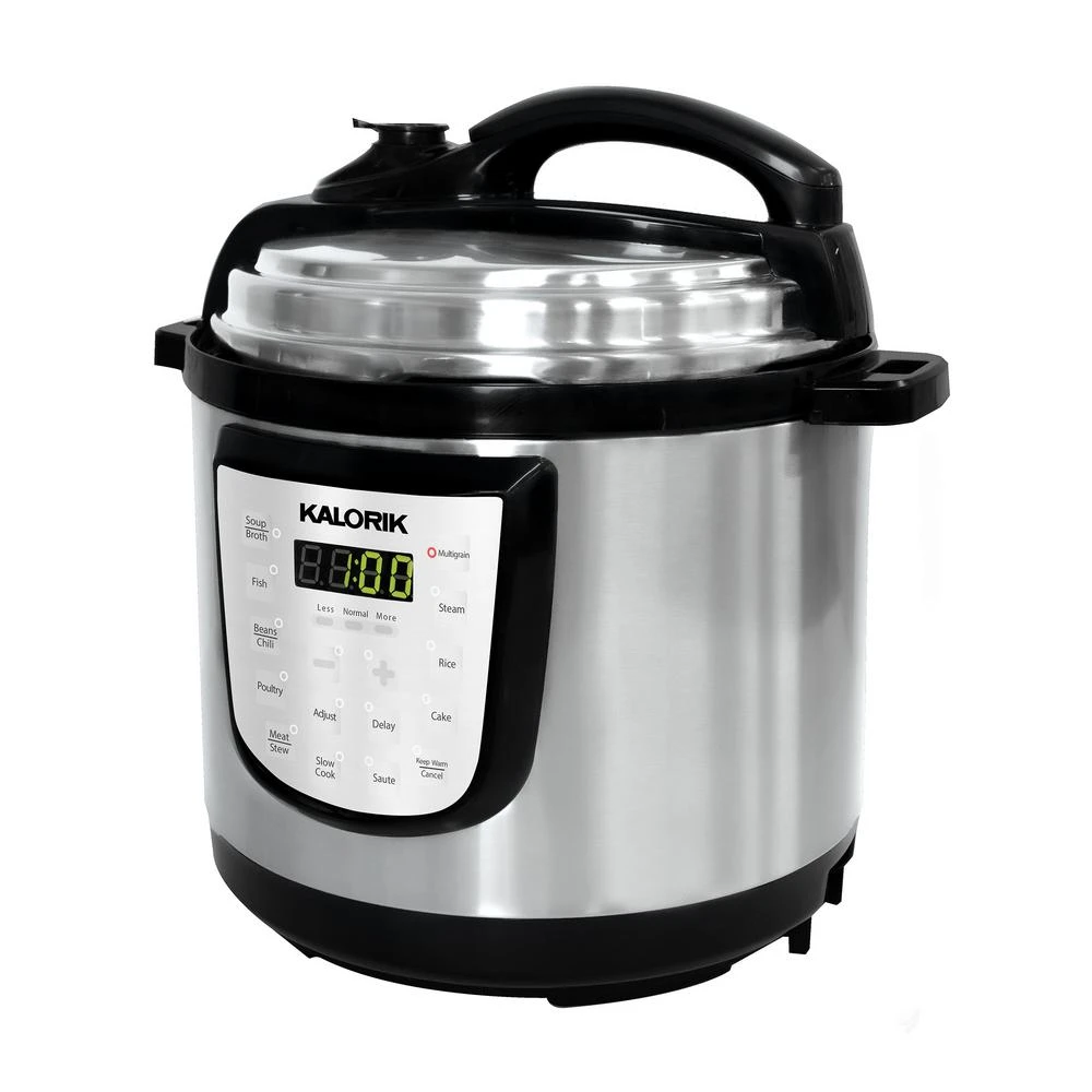 Discover the multiuse, energy-efficient KALORIK 6 qt. Digital Pressure Cooker. This versatile appliance is a pressure cooker, slow cooker and rice cooker, all in one. Prepare warm, homemade meals with little to no effort, as this “hands-off” electric pressure cooker does the hard work for you. The KALORIK 6 qt. Digital Pressure Cooker features 11-smart presets and a Keep Warm function on its user-friendly digital control panel. Make hearty and flavor-rich soups, chilis and stews or light and fluffy rice. Prepare tender, braised meats and vegetables and achieve pan sear-style caramelization. Slow cook your meals to enhance flavor and tenderness. Keep food warm for up to 24-hours or use the delay function to ensure your meal is ready when you are. A safety locking lid and pressure control give you peace of mind, while the appliance’s carry handle and non-slip rubber feet allow for secure operation. The removable nonstick-coated pot makes for easy cleanup.