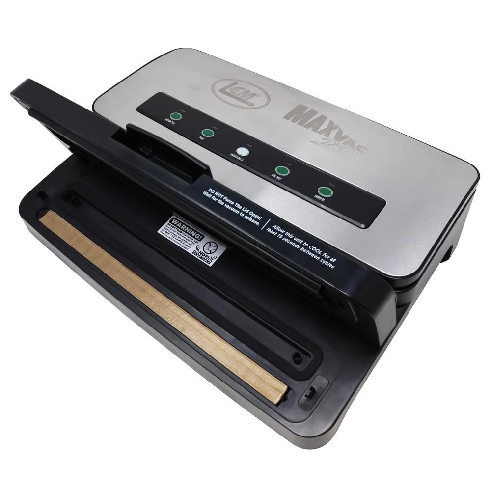 Seal up to 250 times without stopping. This dependable vacuum sealer will extend the freshness and freezer life of your favorite foods. Protects your meat, game, fish, vegetables or fruit from freezer burn and seal in nutrients. Removes air and automatically seals for an amazing storage solution. The stainless-steel construction means it is built to last. The integrated roll material holder and cutter makes it countertop friendly and allow you to save money by customizing bag size to the food you are sealing. The 1-handed locking lid makes it easy to use, no pressing necessary. Includes auto and manual functions that will allow you to control the vacuum time and keep delicate items from getting crushed. Detachable cord. As a bonus, an 8 in. x 10 ft. roll of bag material is included. Compatible with most national brand vacuum bags. 1-year warranty. Lifetime customer service. ETL Certified.