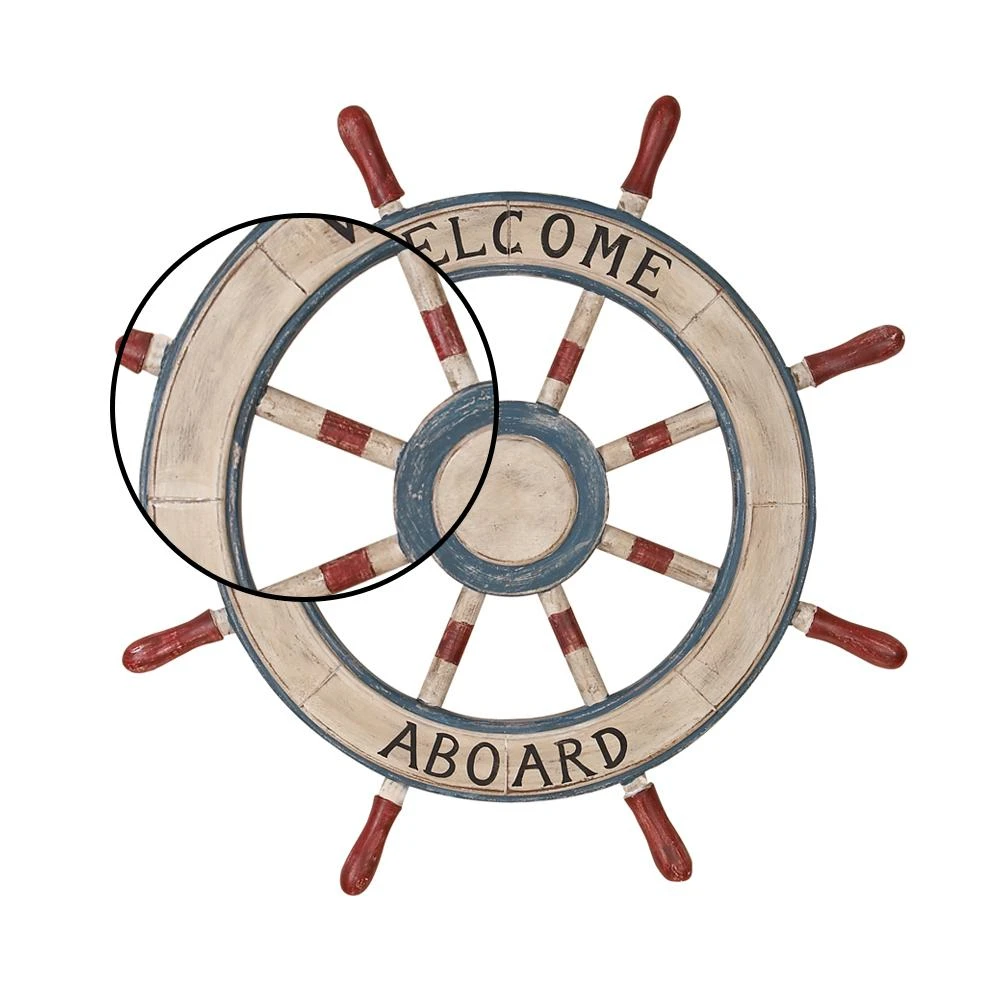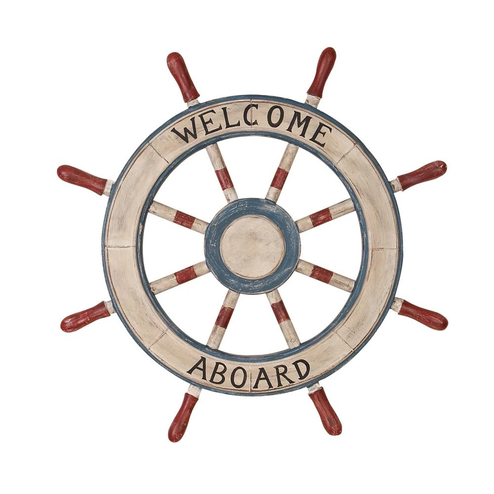 This decorative ship wheel features a “Welcome Aboard” hand typography that is sure to bring a refreshing vibe on nautical-themed settings. It is designed with an off-whitewash paint finish and a classic 8-spoked wheel in distressed crimson red and turquoise to create a perfect ship wheel replica. This decorative piece is designed with a perfect blend of rustic and nautical features that will add a fascinating touch to your home.