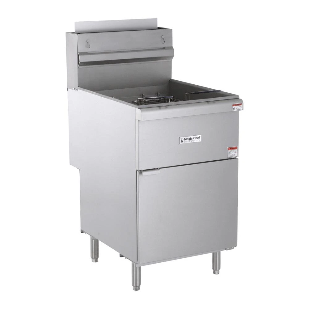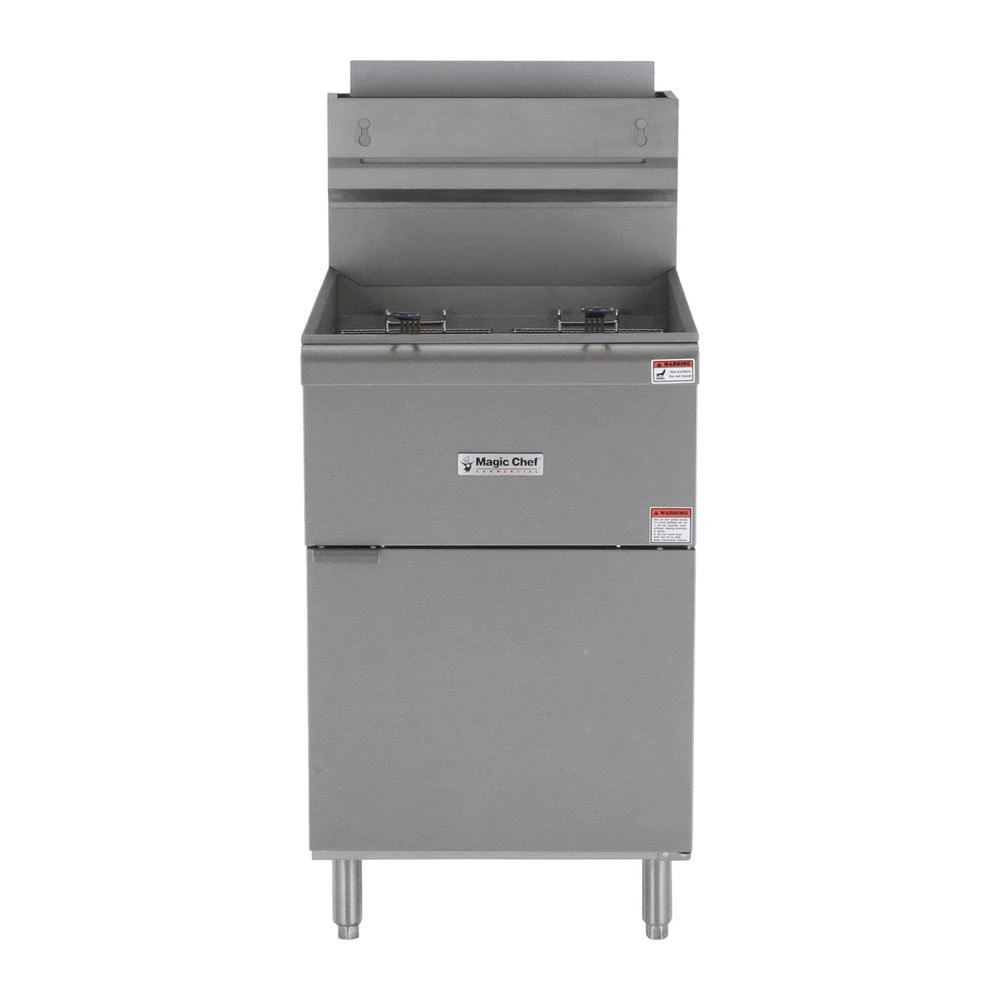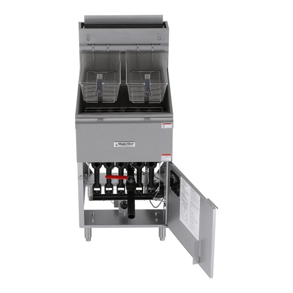 The Magic Chef Commercial deep fryer with 5 burners features 150,000 BTUs of heating power to thoroughly cook your most entrees and sides. With it is oil capacity, it is easy to fry up chicken, French fries, and other fried foods The exterior is made of stainless steel for strength and long-lasting durability. The fry baskets are nickel plated with heat resistant vinyl handles. There is a front drain port, making it very convenient for emptying the oil Natural gas connection is required