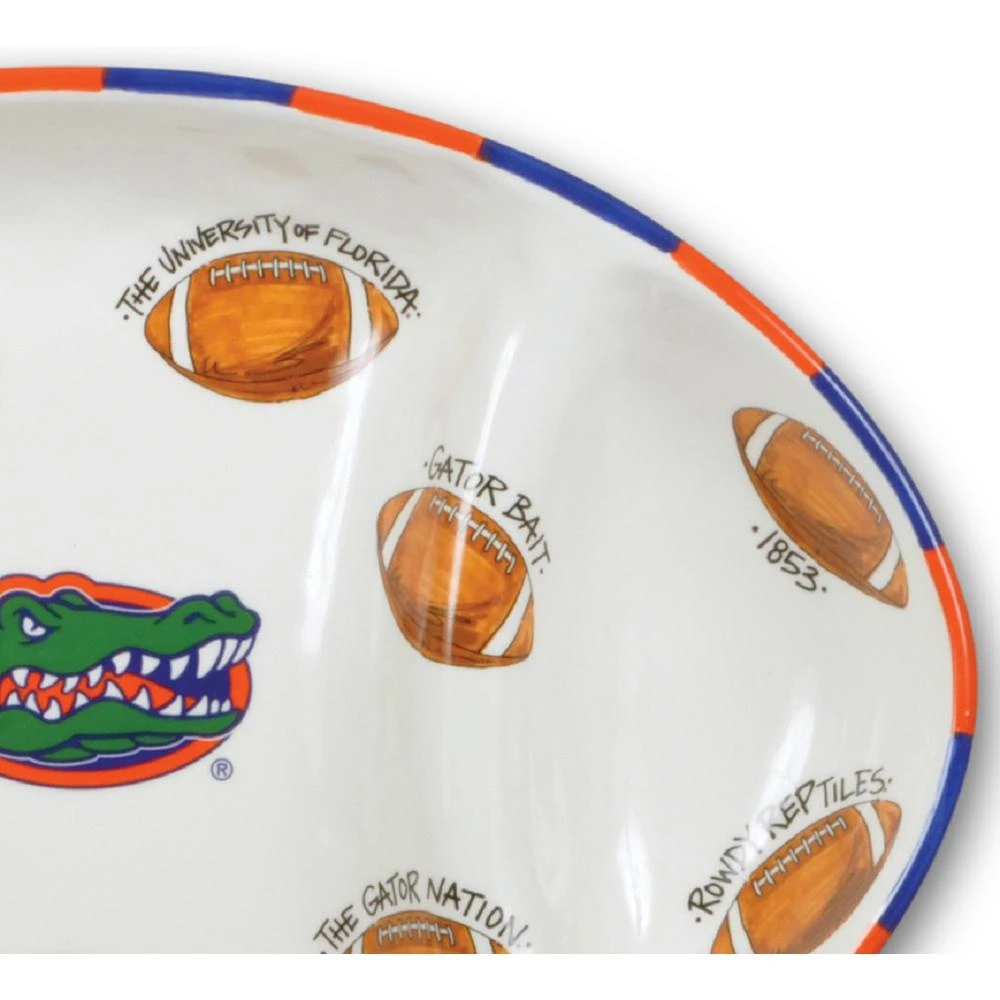 This officially licensed NCAA collegiate football serving platter will be the centerpiece of your next tailgating or game day event. The football shaped ceramic platter decorated in team colors proudly displays your teams logo in the center surrounded by footballs featuring team chants and nicknames. The platter is large enough to hold plenty of your favorite tailgate food and is divided into 3 sections making it easy to serve different items. Great for hors doeuvres, dips, wings, sandwiches, sauces, snacks, or desserts.