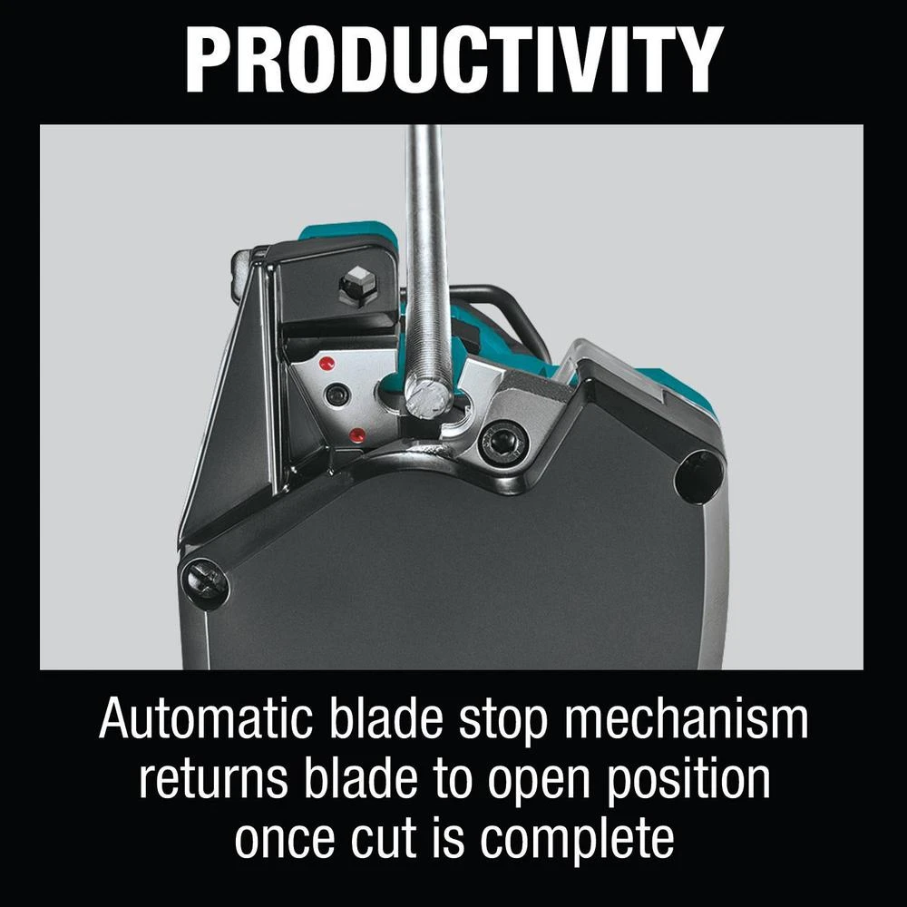 - Automatic blade stop mechanism returns blade to open position once cut is complete to continue operation