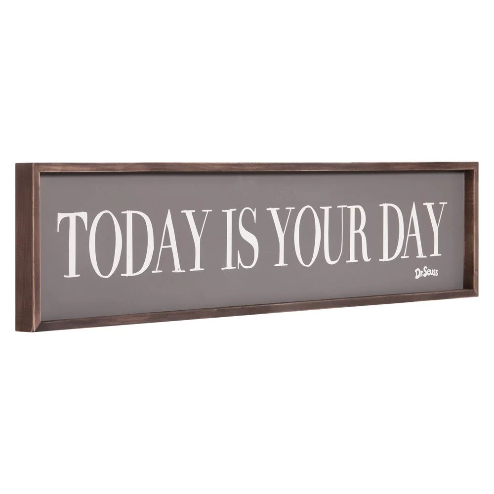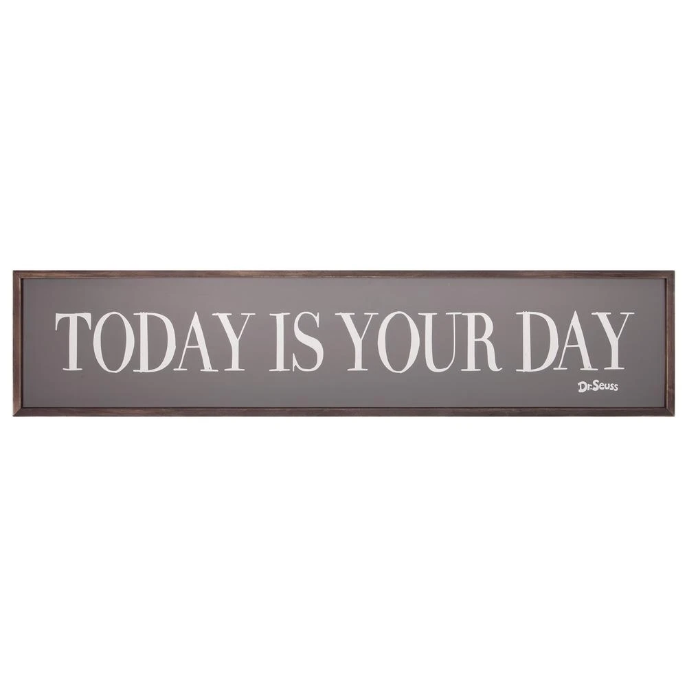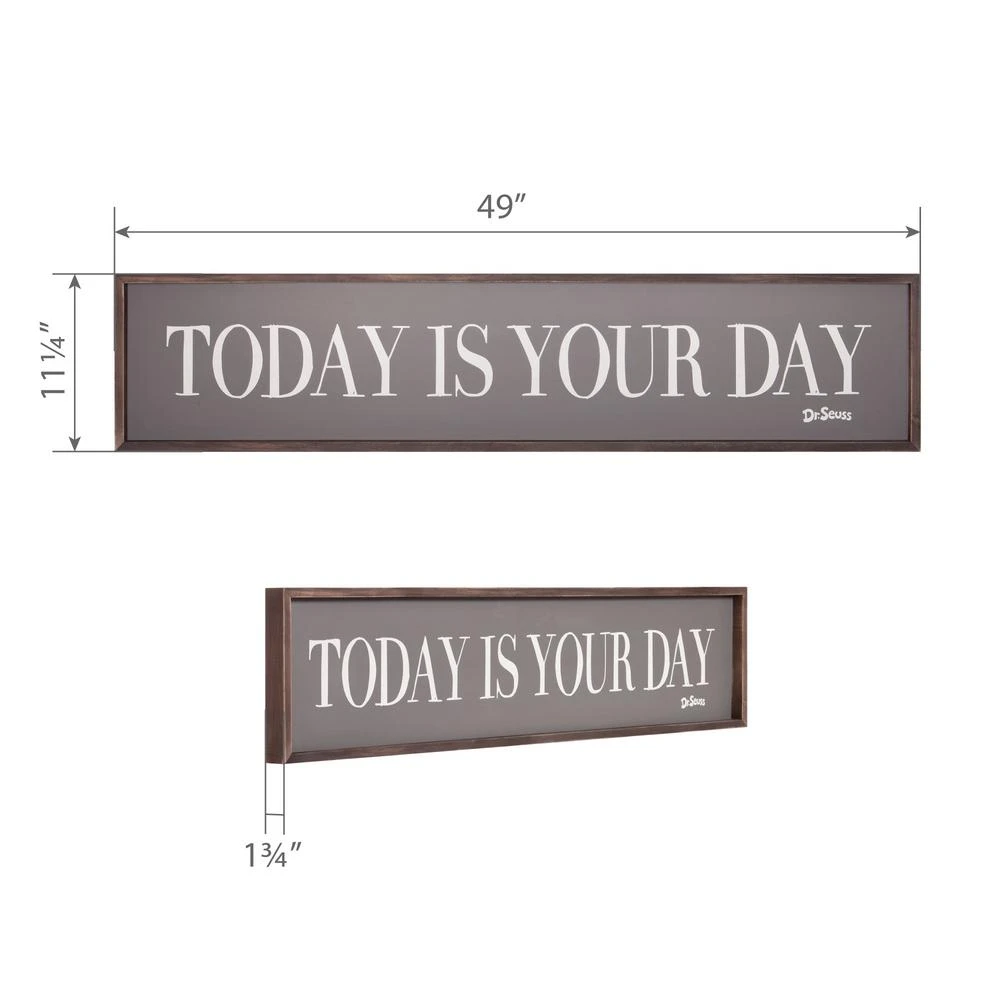 Revisit the Dr. Seuss stories and classic rhymes you loved as a child with this 49×11 Dr. Seuss Today Is Your Day Quote Framed Wood Wall Decor. This wood wall art is a simple, yet rustic decorative piece. Hang this inspirational quote for when you need a motivation boost to remind you of the whimsical adventures of childhood. A rustic mission style wood frame wraps a solid grey backdrop to the bold inspiring typography. Hang this piece in the bedroom, living room or entry way for when Motivation Monday calls.
