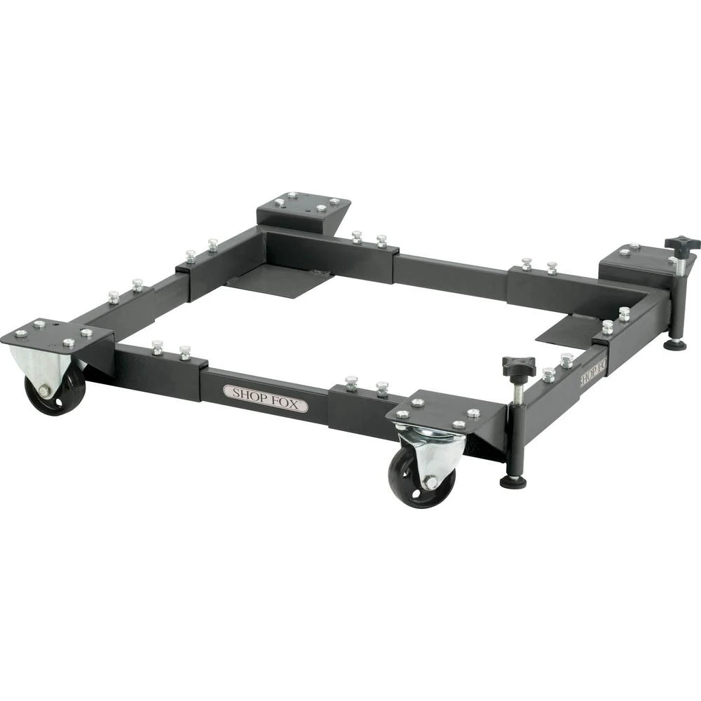 Shop Fox Heavy-Duty Mobile Bases are designed to give you a stable and mobile platform upon which to mount machinery and equipment having a variety of base sizes and weights. The heavy-duty metal casters are arranged on outriggers allowing the machine to sit as low as possible and yet be extremely stable. Swivel casters on 2 corners provide excellent maneuverability. The bolt pattern on the fixed caster side allows orientation of the wheels in either of 2 directions. The base can be assembled in any of 8 configurations providing maximum flexibility of use. The unique 2-piece retractable feet use rare earth magnets to allow the knob to turn while the foot pad is tight to the floor. You will find these mobile bases to be far superior to any mobile base on the market in strength, adjustability and movability.