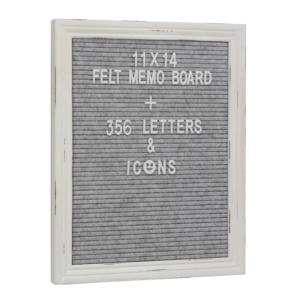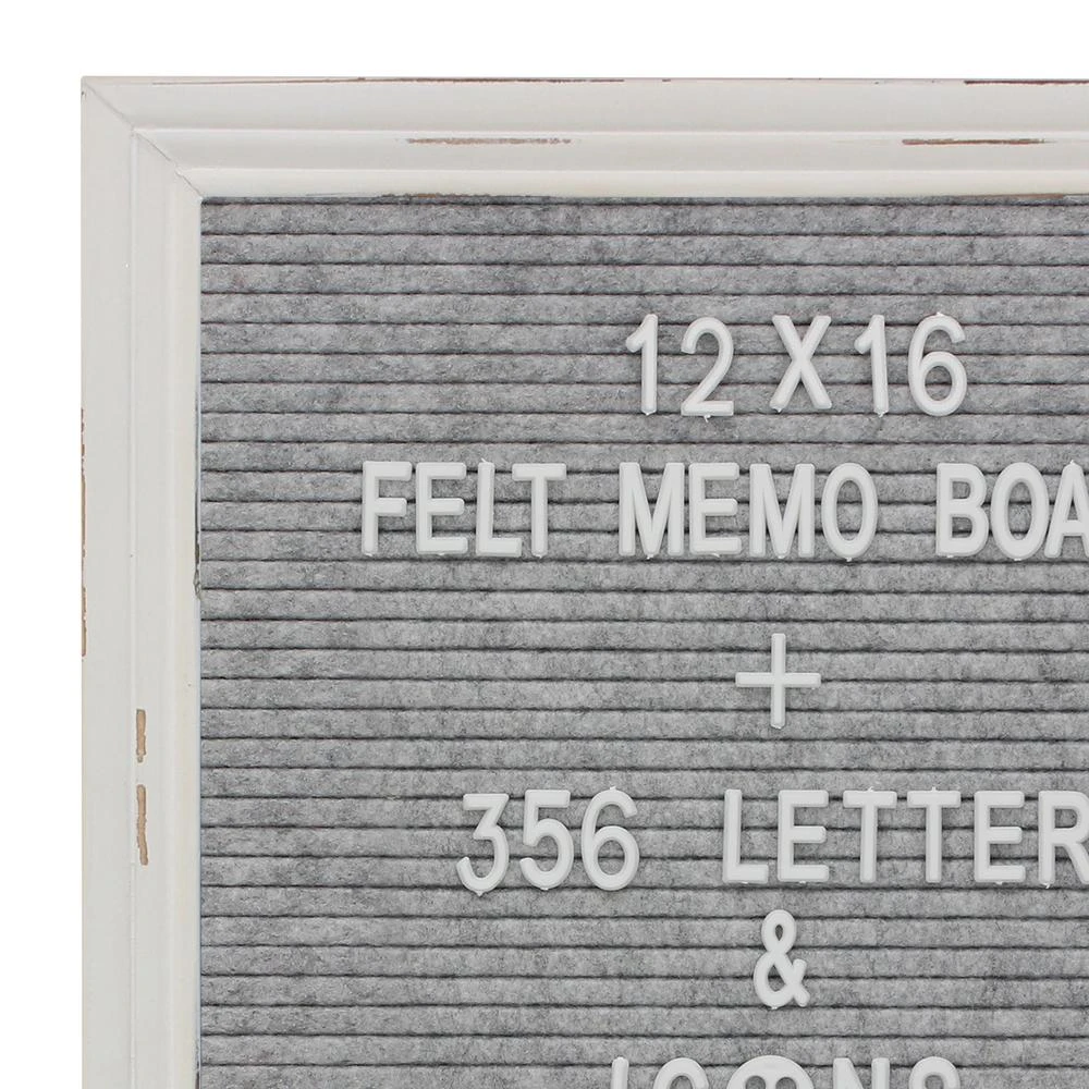 - Message board features a stylish worn white painted wood frame with decorative heather grey felt