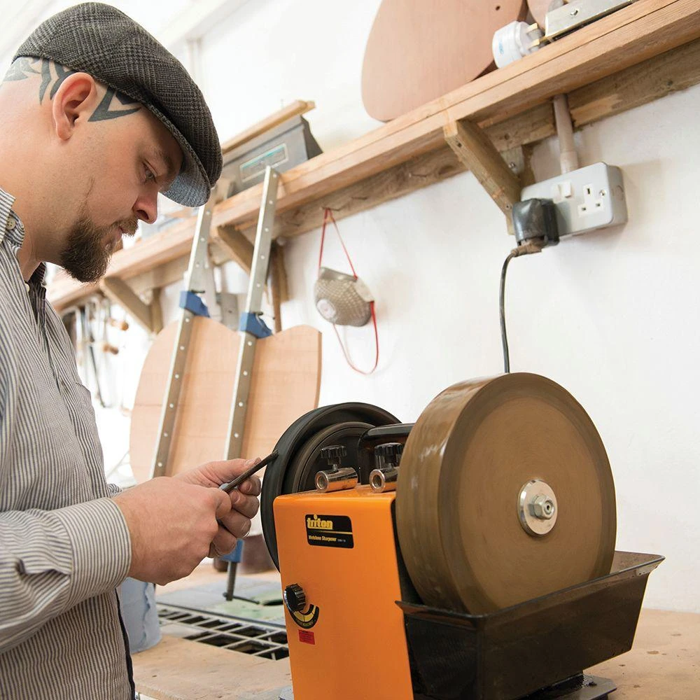 The Triton TWSS10 benchtop Wetstone Sharpener is fitted with a pre-dressed, high-grade, grindstone and leather honing wheel. The slow-speed Wetstone sharpener produces a polished, razor-sharp edge on cutting and shaping tools. Used in conjunction with the supplied honing compound the leather honing wheel delivers a finely polished finish, ideal for hand tools, knives, plane irons/blades, chisels and other wood-carving tools. Using the support arm, angle guide and jig, it is easy to shape and sharpen a blade precisely to the angle required.
