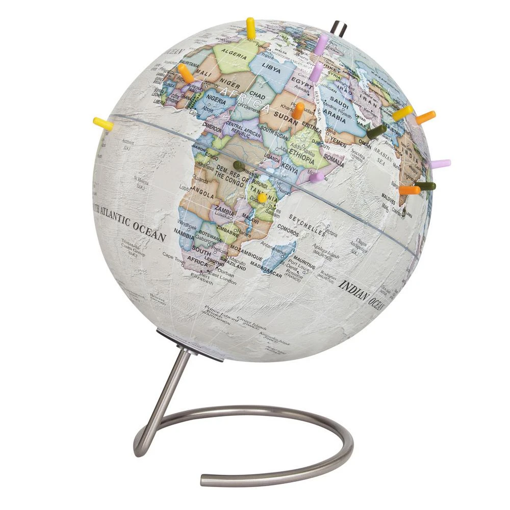 The MagneGlobe (educational antique oceans) is a 9 in. metal globe featuring educational l and mass mapping and blue ocean styling with 100’s of up-to-date geographic points of reference, boarders and topographical features. It includes 32 magnetic pins of various color that adhere to the metal globe to show off your places of past, current or future travel, family trips, locations of friends and family, current events, business locations or just about anything you would like to identify. This globe includes a stainless steel inclination mounting that can be rotated left or right for full view and access to magnetic pins. This desktop size globe is perfect for any home or office location and makes a great gift for those who love to travel, learn or simply remember places of interest.